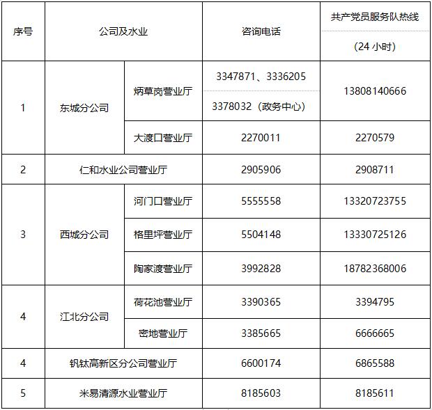 公司及水業咨詢電話及共產黨員服務隊電話: