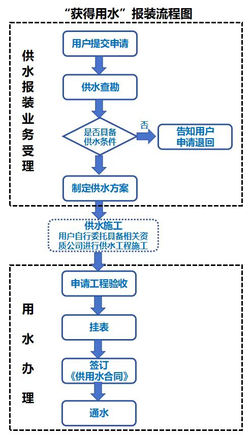 (一)供水報裝業務受理(2天):用戶提交申請、供水查勘、制定供水方案(如達不到給水要求及時以電話或書面方式給予用戶答復);